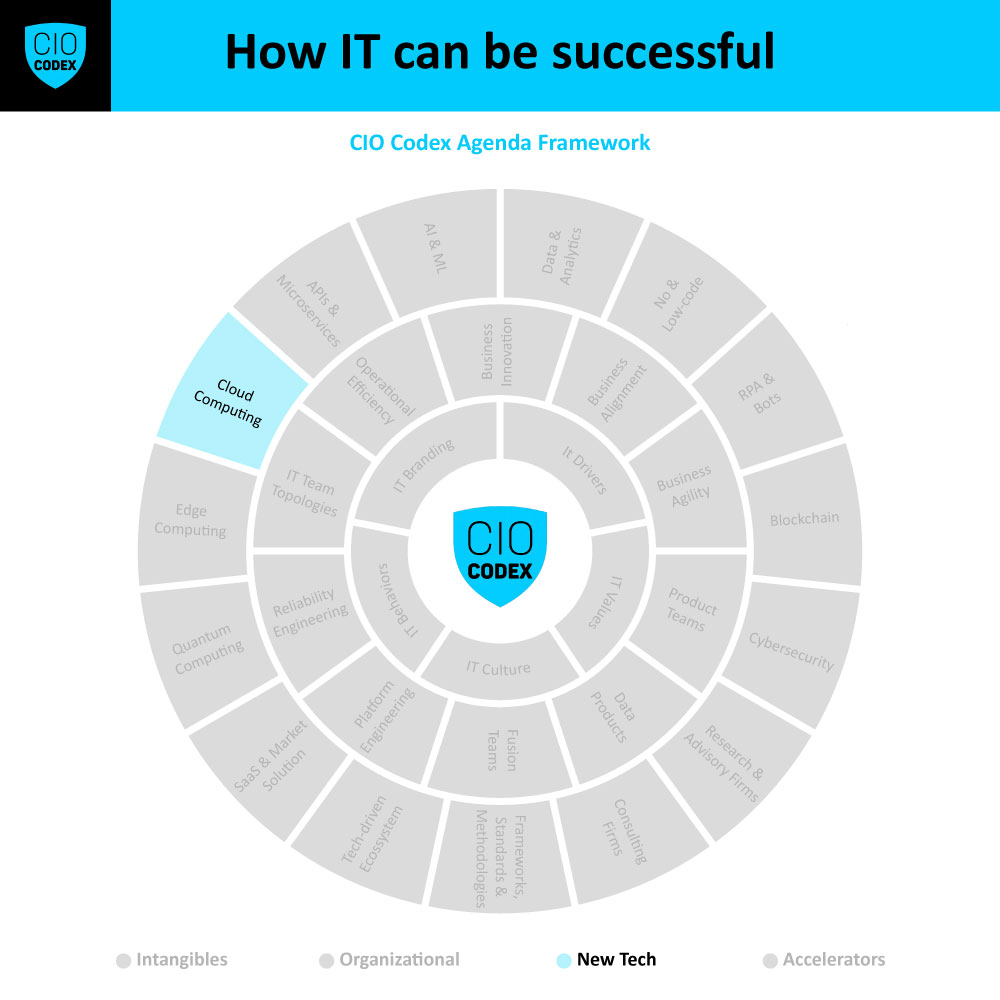 No contexto do CIO Codex Agenda Framework, Cloud Computing é identificado como um vetor chave na camada New Tech, representando um elemento catalisador na jornada de transformação digital das organizações.