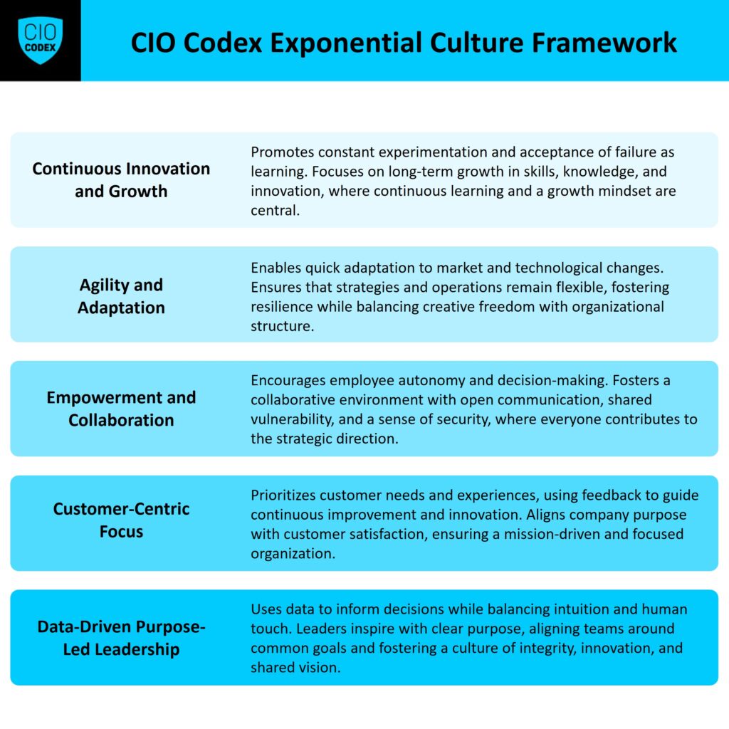 O CIO Codex Exponential Culture Framework foi projetado para ajudar organizações a cultivarem uma cultura que favoreça o crescimento exponencial e a inovação contínua.