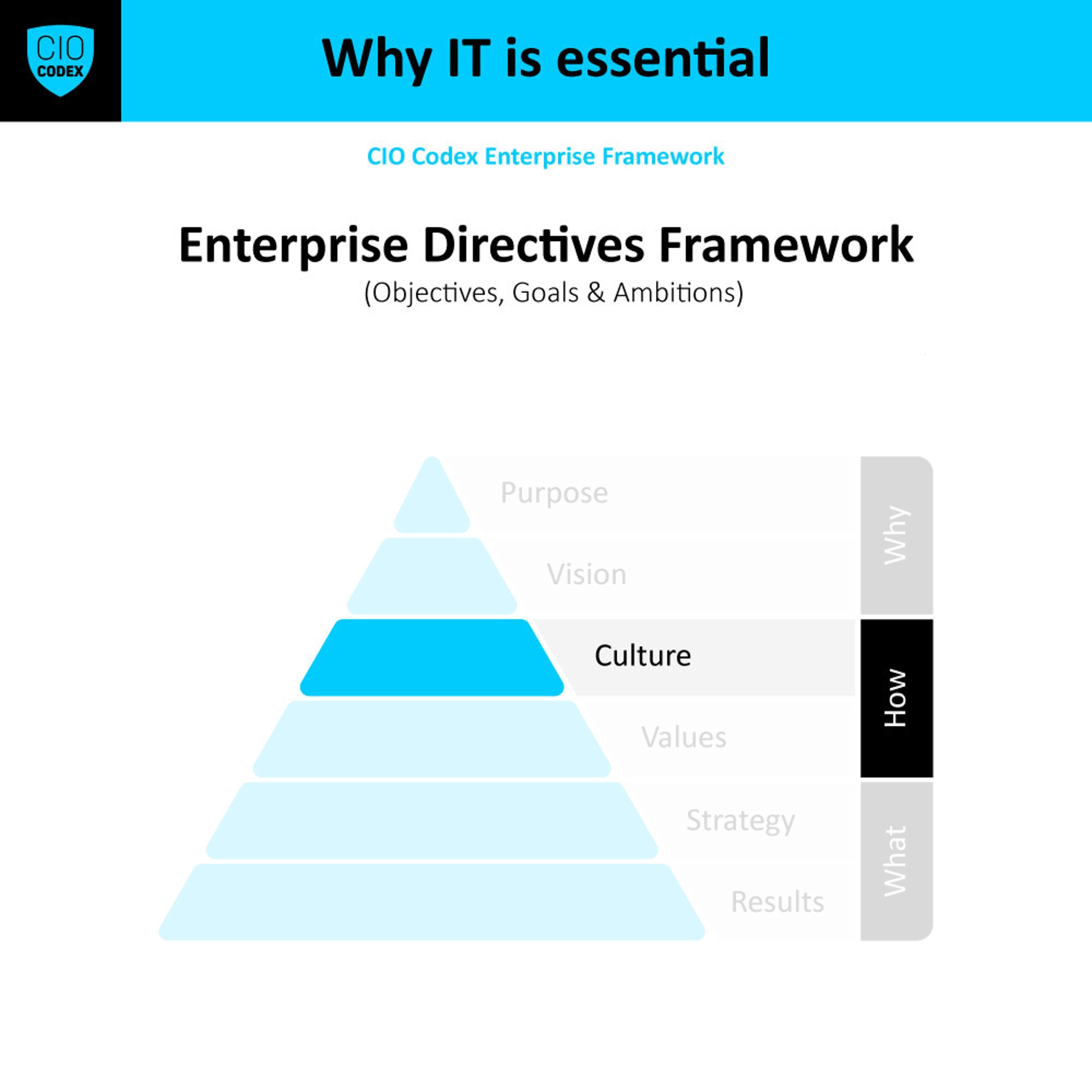 Seguindo adiante, agora na parte intermediária da pirâmide de diretrizes, dentro do “How”, que busca explicar a forma como cada organização pensa e opera, verifica-se a camada Culture, que no ambiente corporativo é um aspecto vital e frequentemente subestimado da estratégia organizacional.