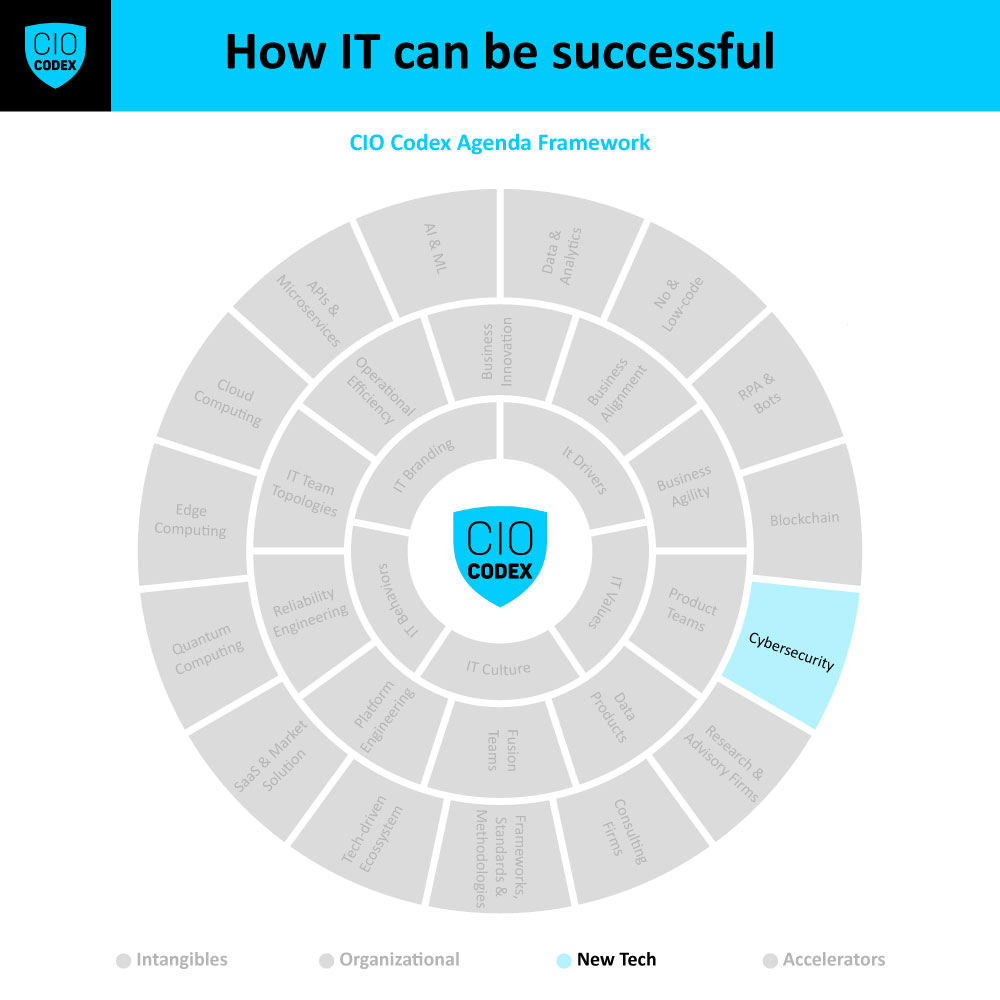 Cybersecurity é um tema de vital importância na camada New Tech do CIO Codex Agenda Framework, refletindo uma necessidade crítica no cenário digital contemporâneo.