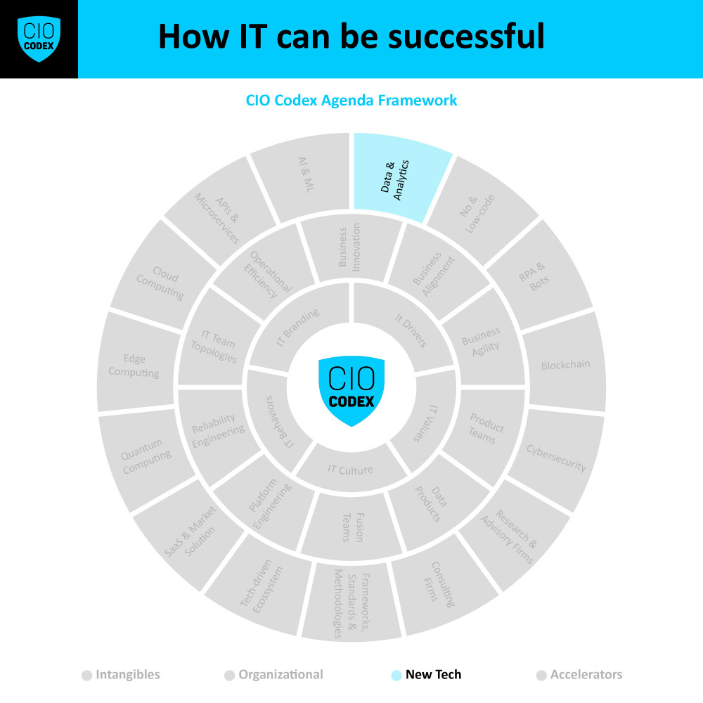 Data & Analytics formam um eixo estratégico crucial dentro da camada New Tech do CIO Codex Agenda Framework, refletindo a importância crítica da coleta, processamento e análise de dados para informar e direcionar decisões de negócios.