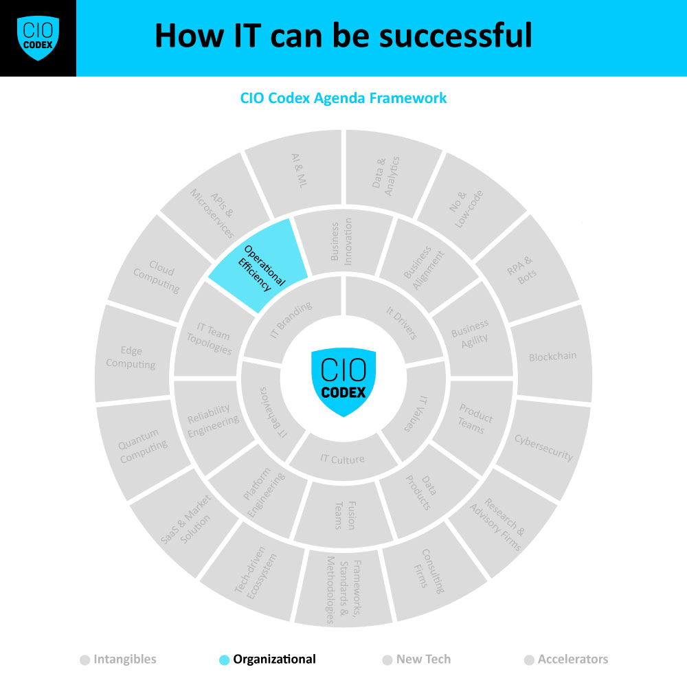 Operational Efficiency é um princípio estratégico crucial na camada Organizational, que enfatiza a busca por eficiência operacional máxima na área de tecnologia, abordando a gestão de TI com a mesma seriedade e rigor que se espera de uma empresa independente.