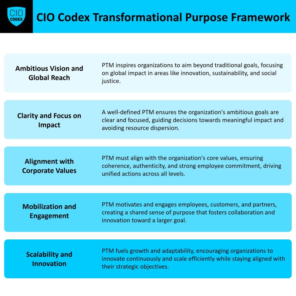 A seguir são explorados os cinco pilares do CIO Codex Transformational Purpose Framework: Ambitious Vision and Global Reach, Clarity and Focus on Impact, Alignment with Corporate Values, Mobilization and Engagement, e Scalability and Innovation, sendo que mais detalhes são abordados em tópicos de conteúdo específico: